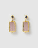 Shop our Rose Drop Earrings in Rose Quartz Blue. Made from a stunning natural rose quartz stone and set in 18k gold plated hardware. Rose quartz is said to be the crystal of love, with energy of compassion, peace, tenderness, healing, nourishment and comfort. Wear this piece all the time for some extra feminine energy.