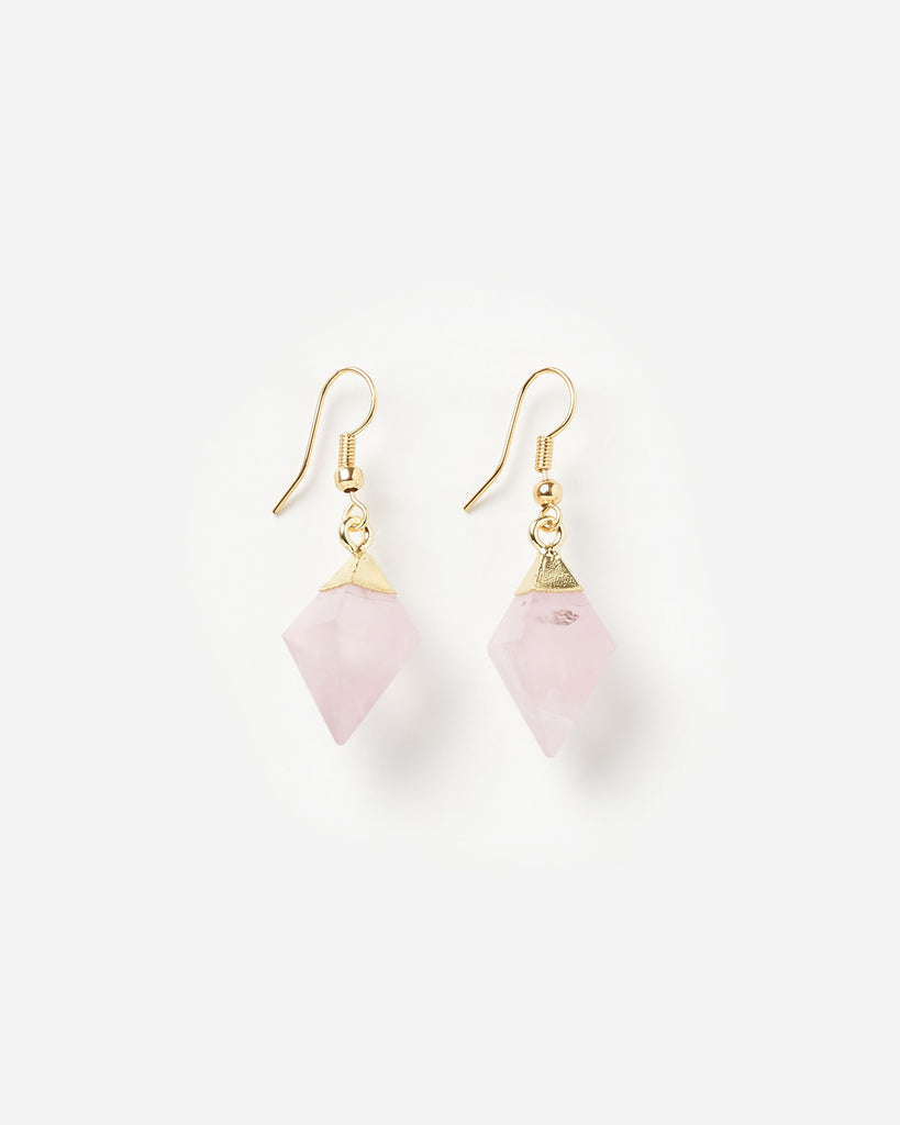 The Eliza Earrings in Rose Quartz Gold are the simple yet eye catching you need in your jewellery collection. The diamond shaped earring is crafted from natural stone with gold plated hardware. Wear with everything from frayed denim shorts to floaty floral dresses.