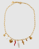 Embrace luxe island styling this season with our Sabina Charm Necklace in Gold. Featuring a chain of chunky fine detailed gold and pearl charms, this necklace will pair perfectly with printed floral dresses this Summer.