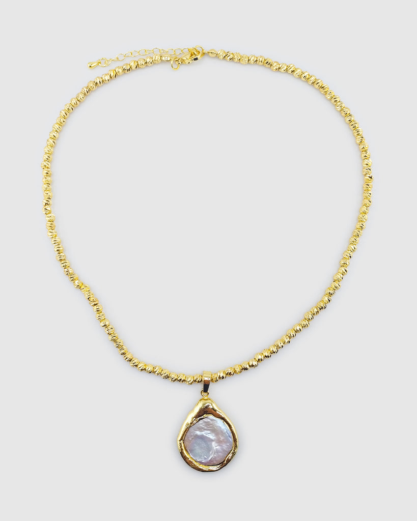 Embrace luxe island styling this season with our Ambra Necklace in Pearl. Featuring a delicate linked chain, and a stunning freshwater pearl enclosed in 18k gold plating, this necklace will pair perfectly with with any outfit for summer.