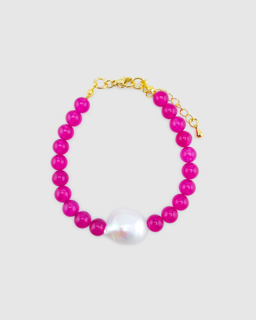 Soft, feminine, and effortlessly elegant, the Aster Bracelet in Pink is a delicate piece designed to add a subtle pop of color to your jewelry collection. Featuring beautiful pink gemstone beads and a luminous freshwater baroque pearl centerpiece, this bracelet blends natural charm with timeless style.