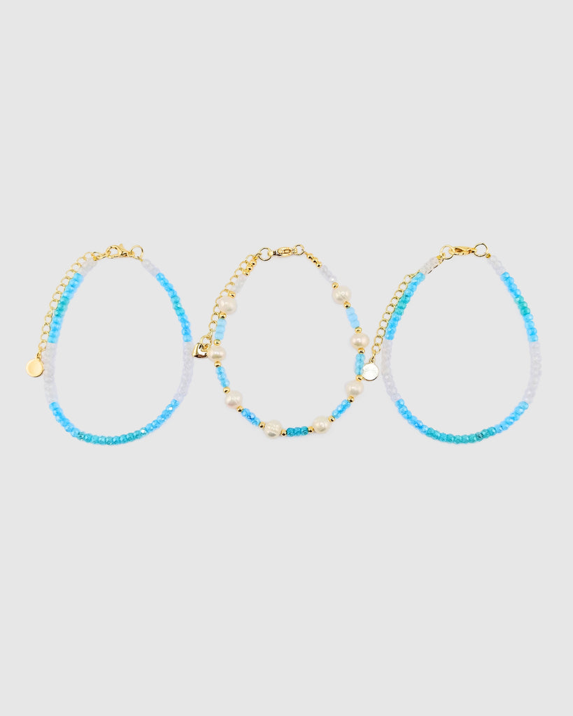 Add shimmer, texture, and effortless elegance to your wrist with our newest Crystal Beaded Bracelet Stack in Light Blue. Designed to elevate your everyday look, each bracelet features a radiant mix of faceted crystal beads and luminous freshwater pearls, creating the perfect balance of sparkle and sophistication.