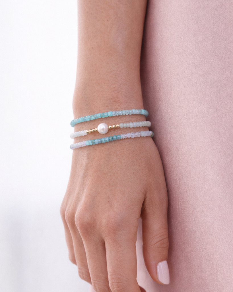 Add shimmer, texture, and effortless elegance to your wrist with our newest Crystal Beaded Bracelet Stack in Light Blue. Designed to elevate your everyday look, each bracelet features a radiant mix of faceted crystal beads and luminous freshwater pearl, creating the perfect balance of sparkle and sophistication.