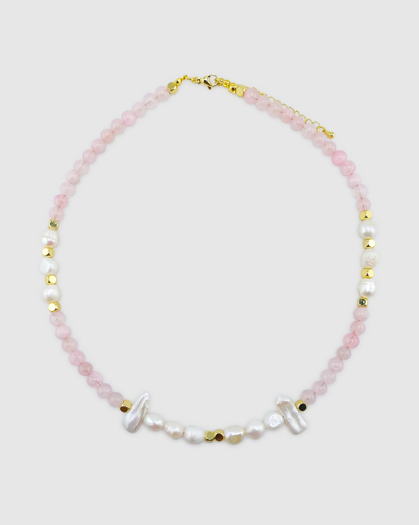 Lightweight and versatile, the Marissa Necklace can be worn alone as a statement piece or layered with other necklaces for a modern, curated look. Its soft pink tones paired with luminous pearls make it perfect for both everyday styling and special occasions.