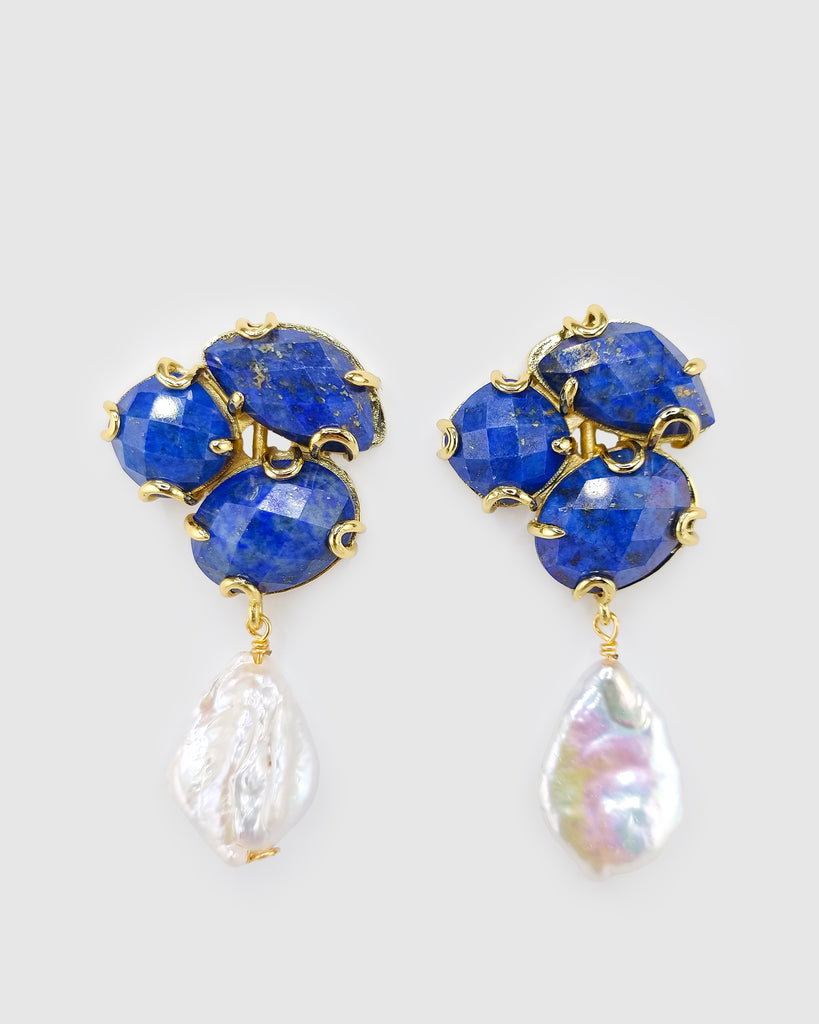 Shop the Ophelia Earrings in Blue Lapis Pearl. Made from a stunning natural Blue Lapis stone and set in 18k gold plated hardware, paired with delicate Pearl. Wear this piece all the time for some extra feminine energy.