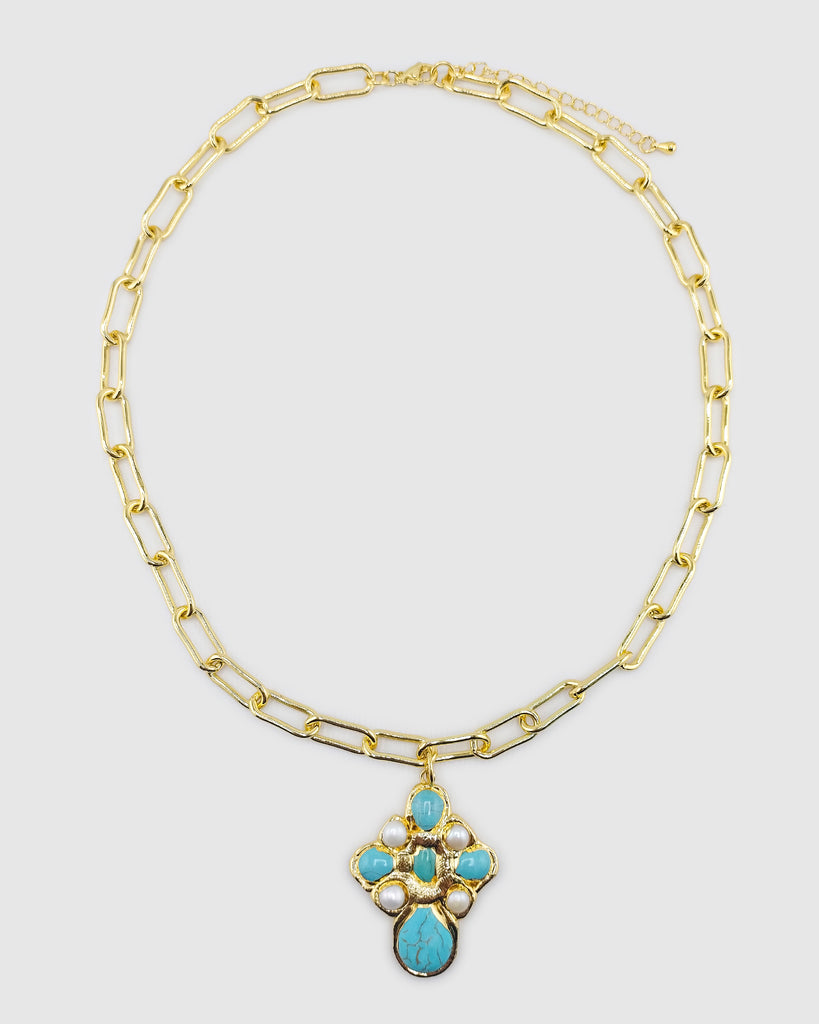 Embrace luxe island styling this season with our Sephira Necklace in Turquoise. Featuring a delicate linked chain, and a large turquoise pearl pendant, this necklace will pair perfectly with with any outfit for summer.