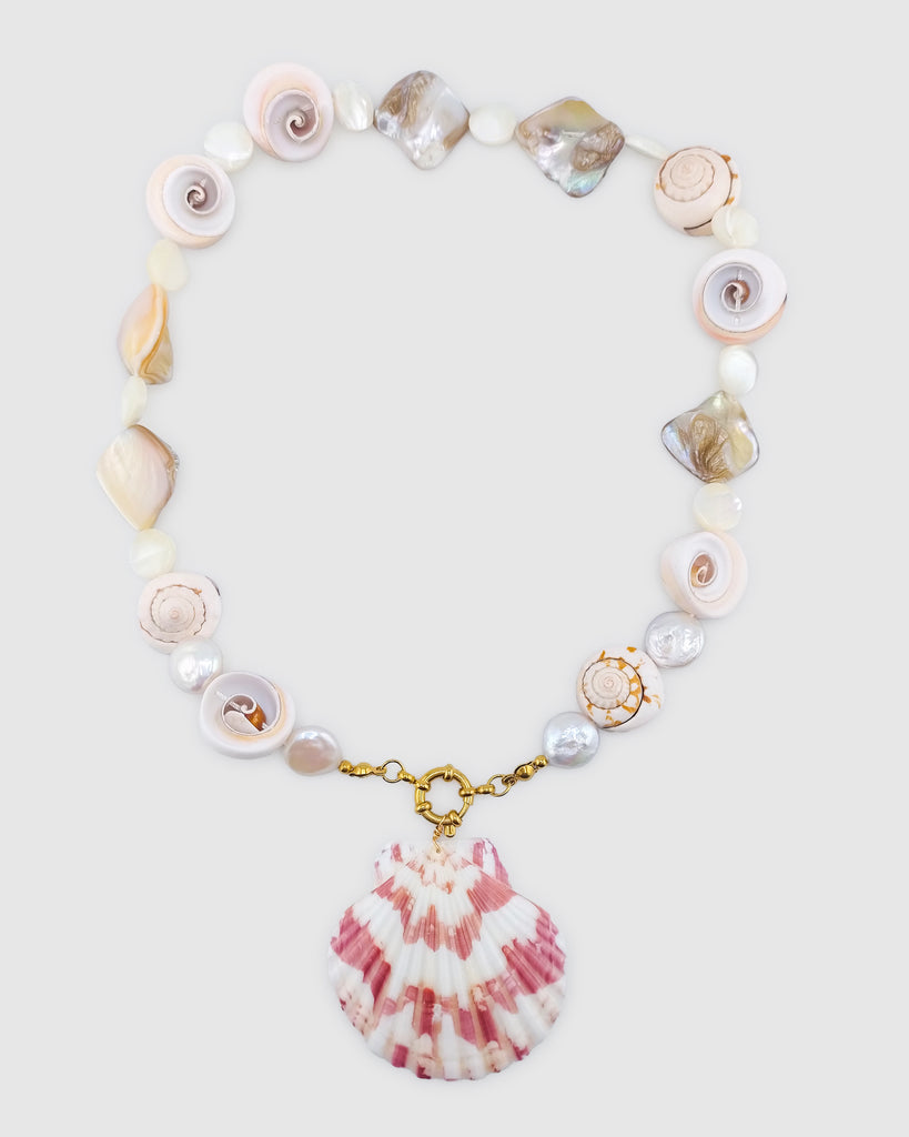 Embrace coastal elegance with our Sereia Necklace — a delicate blend of shells, pearls, and ocean-inspired charm. This beautiful necklace features a stunning pink and white scallop shell pendant, reminiscent of sun-soaked beaches and salty sea breezes. Adorned with dainty shells and freshwater pearls along a fine chain, the Sereia Necklace is the perfect accessory to add a touch of seaside glamour to any outfit.