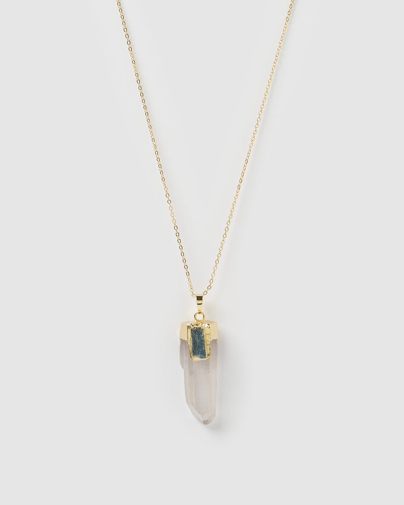 Shop our Tabitha Necklace in Angelite, with 18k gold plated hardware and a clear quartz stone featuring a natural angelite embellishment. Add an extra touch to your next look!
